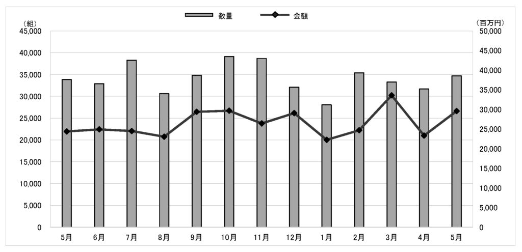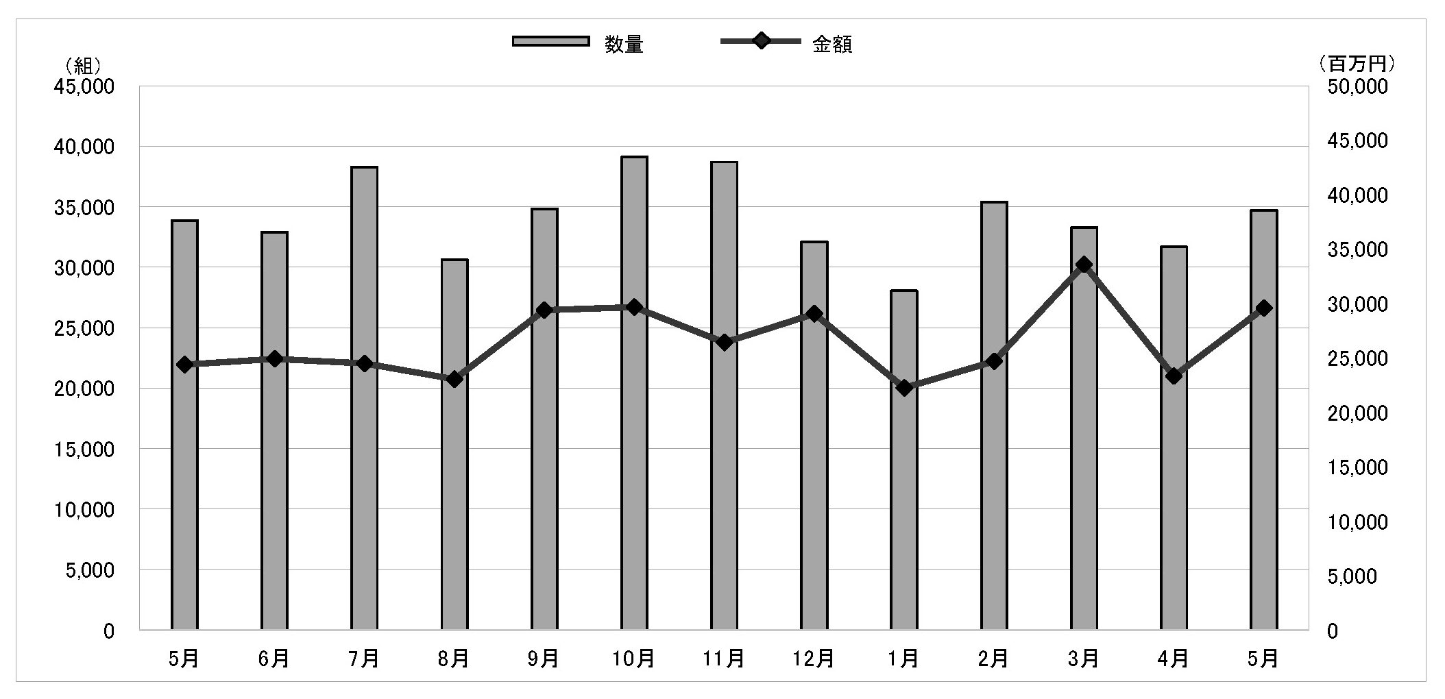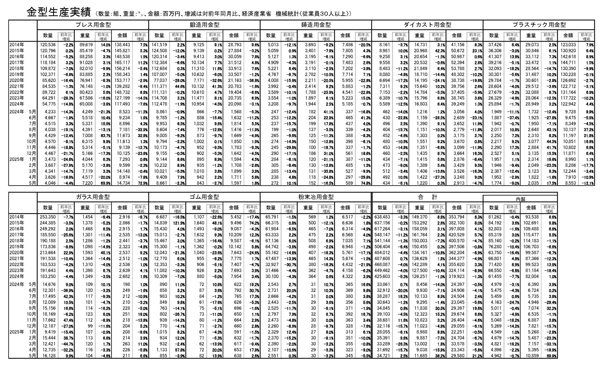 2025年5月の金型生産は、前年同月比21.2%の大幅増で295億7,970万円となった。前月比では26.7%の大幅増だった。数量は前年同月比2.5%増、前月比では9.6%増となり3万4,721組。重量は前年同月比38.2%の大幅増、前月比でも29.3%の大幅増で1万1,684トンとなった。