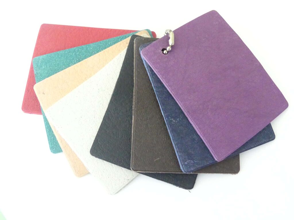 シボ転写やバレル研磨でより深みのある表情付けも可能。顔料の調合で本革にはなかった色合いも再現でき、アレンジの用途は広い。