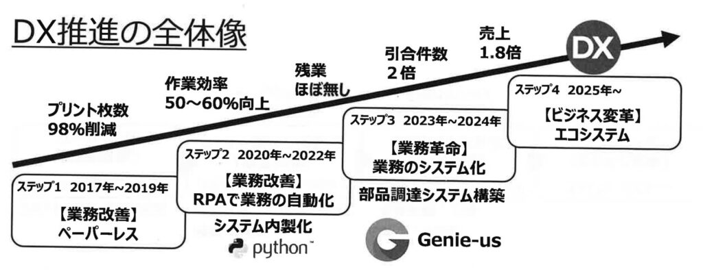 さらに、基幹システムの部品調達システム「Genie‐us」を開発。他のファイル管理やメール共有サービスとの連携、顧客情報データベースや仕入先情報のインポート機能を持ち、見積依頼から納品まで一連の流れを各担当が多様な形式で共有化。自社業務に沿った直感的な画面構成で、見積から発注まで一気通貫で作業を完結できる仕組みで作業漏れなどなく、販売や物流担当者の作業を30~50%削減した。加えて協力工場にもWebサービスを展開。見積依頼から回答、発注から納品、送状番号など登録してもらうことで業務効率化を推進。今後はグローバルで協力工場や顧客とシームレスに連携できるオートメーションプラットフォーム構築を目指す。
