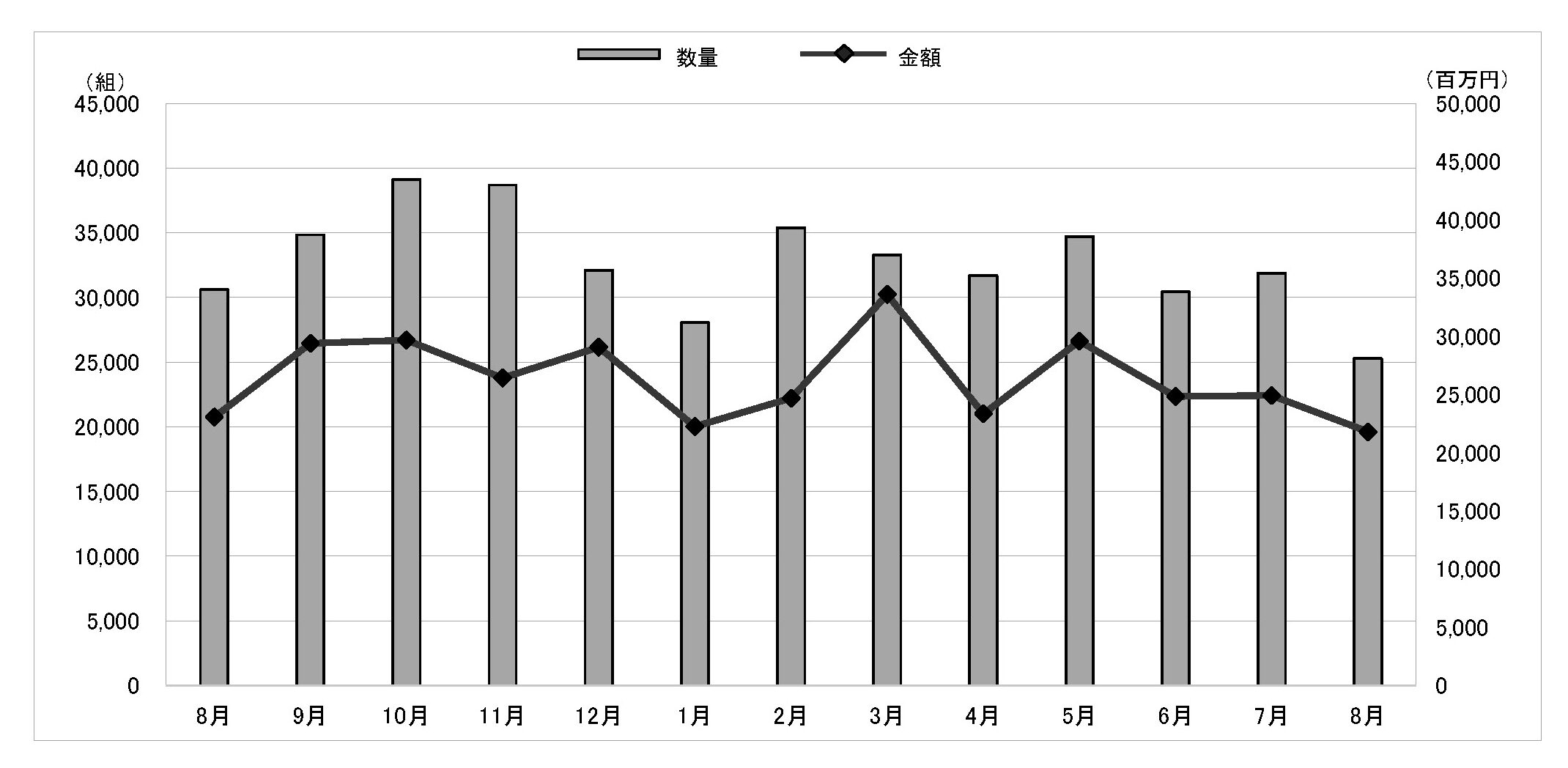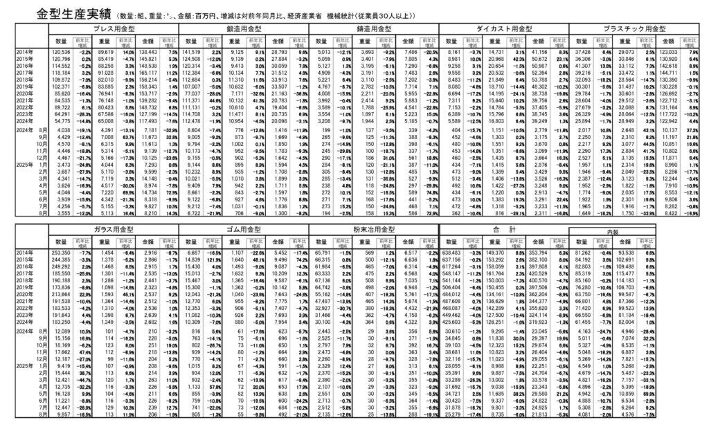 2025年8月の金型生産は、前年同月比5.3%減の218億1,305万円となった。前月比では12.5%の減少だった。数量は前年同月比17.4%の大幅減、前月比でも20.7%の大幅減となり2万5,279組。重量は前年同月比6.0%減、前月比では10.9%の減で8,735トンとなった。