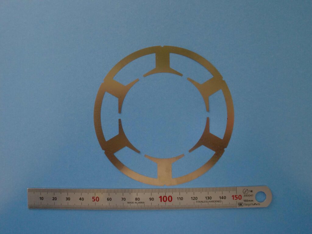 プレス金型から加工までを手掛けるナカムラマジック(長野県上伊那郡、0265・79・3880)は、アモルファス(非晶質)合金を使用した外径Φ100mmのステータコアを一体加工で量産できる金型を開発。硬度約900HV、板厚25μmで、連続生産100万ショットを実現した。