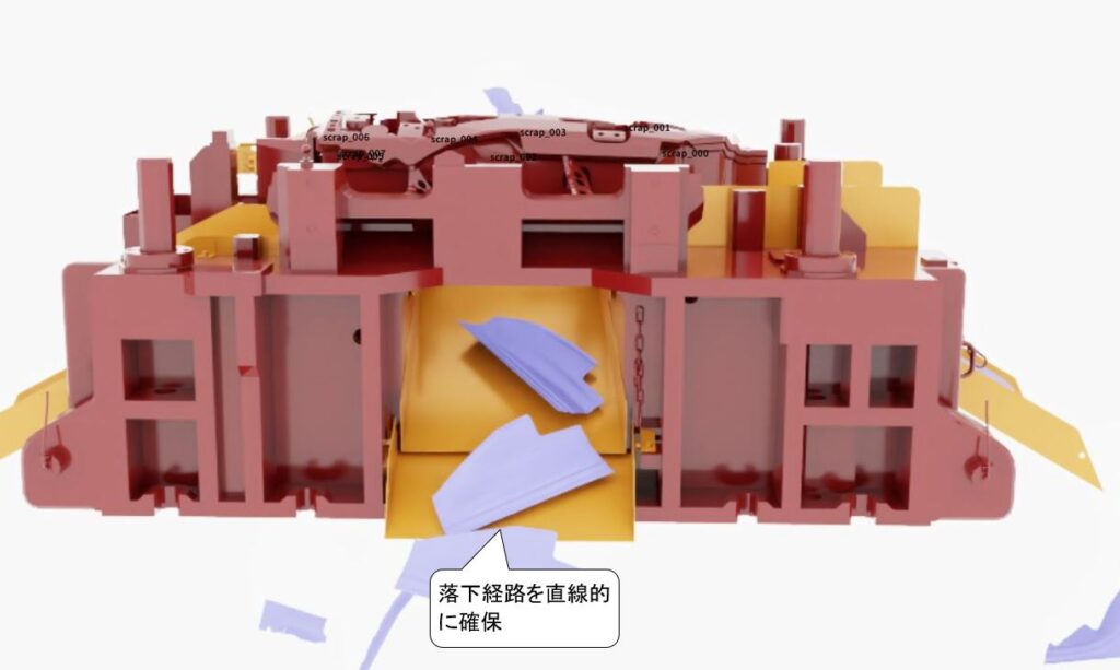そこで、シミュレーション時に「仮想的合力(スクラップ落下時に、スクラップへ働くさまざまな力をすべて加算した力)」と「ゲームエンジン」を活用。「仮想的合力」を毎回変化させることで、すべての落下動作を再現し、落下不良が検出できるようになった。また、既存の機構解析機能ではなく、ゲームのオブジェクトを動かす「ゲームエンジン」に金型のデータと仮想的合力を組み込み、スクラップ落下不良の再現に成功した。