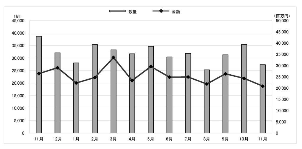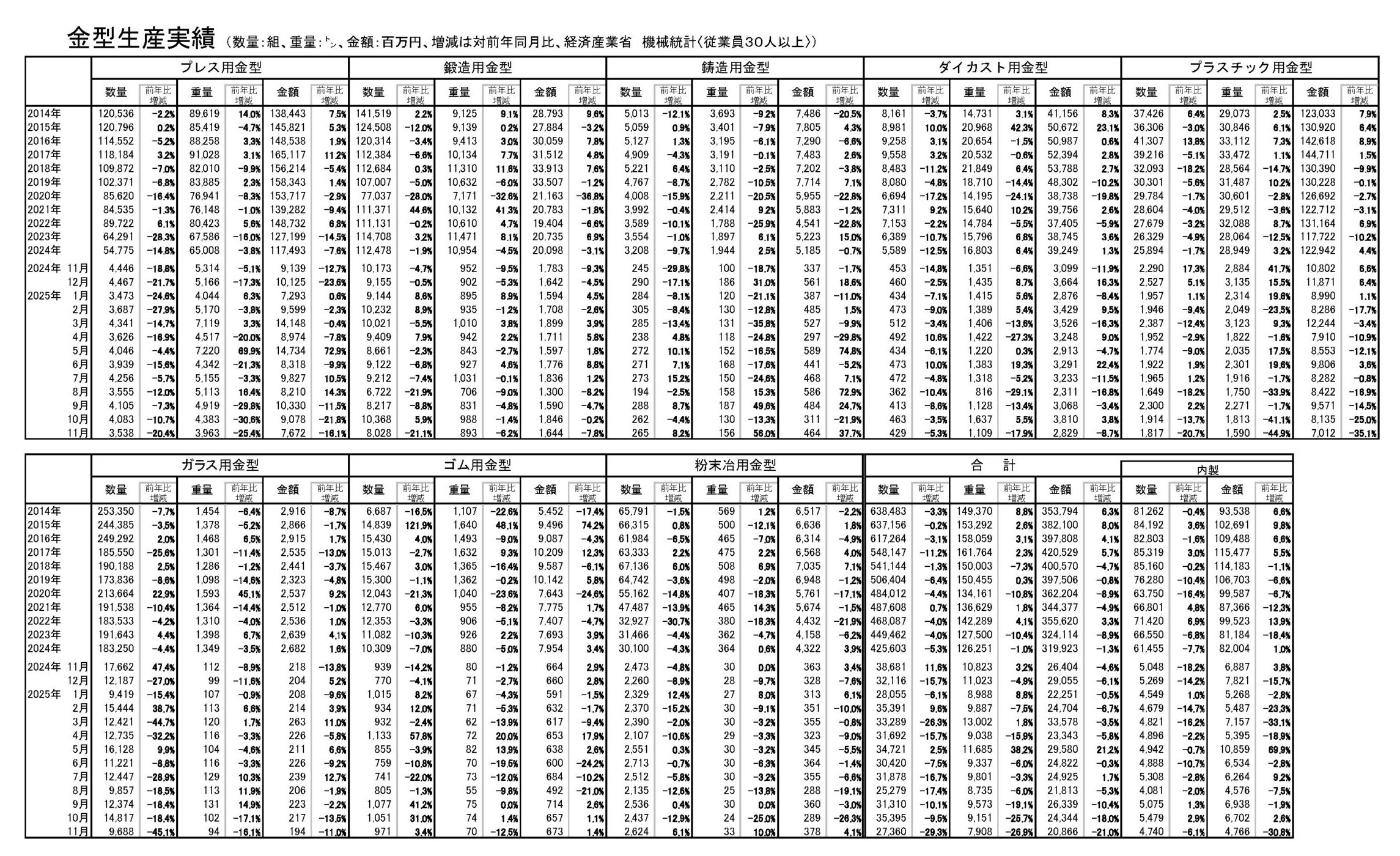 2025年11月の金型生産は、前年同月比21.0%減の208億6,604万円となった。前月比では14.3%の減少だった。数量は前年同月比29.3%減、前月比では22.7%の減となり2万7,360組。重量も前年同月比26.9%減と大きく減少、前月比では13.6%の減で7,908トンとなった。